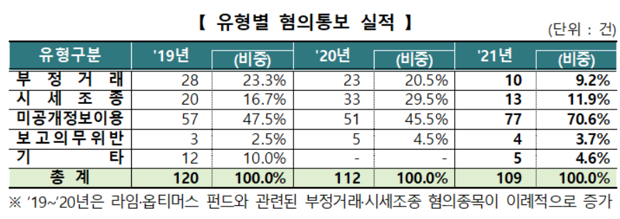 이번에 적발된 불공정거래의 특징은 미공개 정보 이용 행위가 증가했다는 점이다. 호재성 정보 이용 비중은 2020년 42%에서 2021년 66.2%로 늘었다.
