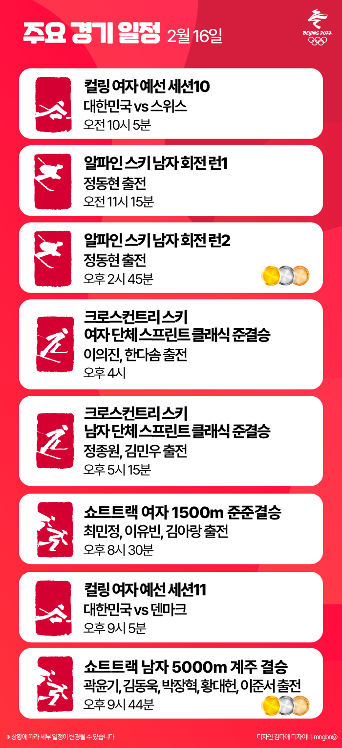 [베이징 동계올림픽] 오늘의 경기일정 -2월 16일