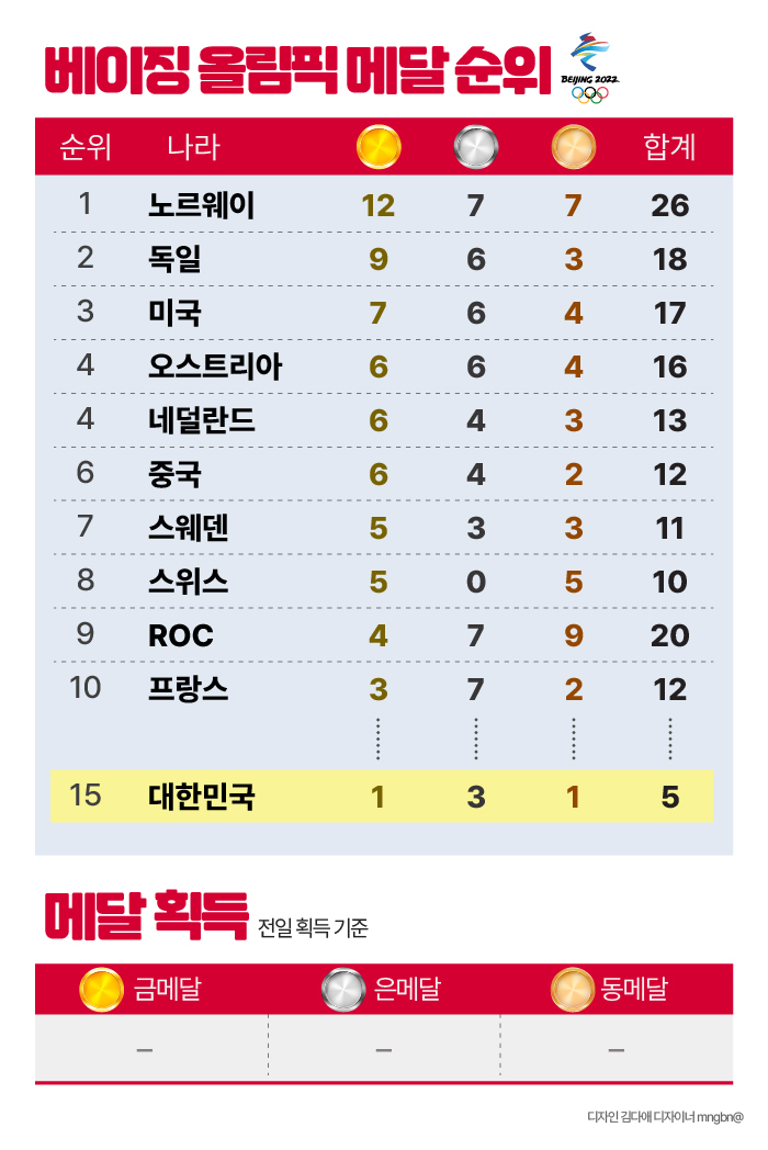 2022 베이징 동계올림픽 13일 차, 국가별 메달 순위를 보면 노르웨이가 금메달 12개, 은메달 7개, 동메달 7개로 종합순위 1위를 기록했다. 대한민국은 금메달 1개, 은메달 3개, 동메달 1개로 종합순위 15위에 올라있다.