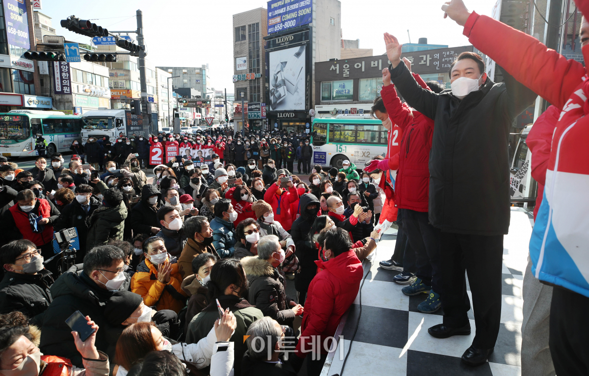 윤석열 국민의힘 대선 후보가 17일 오전 경기도 안성시 서인사거리에서 열린 '윤석열이 대한민국에 안성맞춤!' 안성 유세에서 지지를 호소하고 있다. 국회사진취재단
