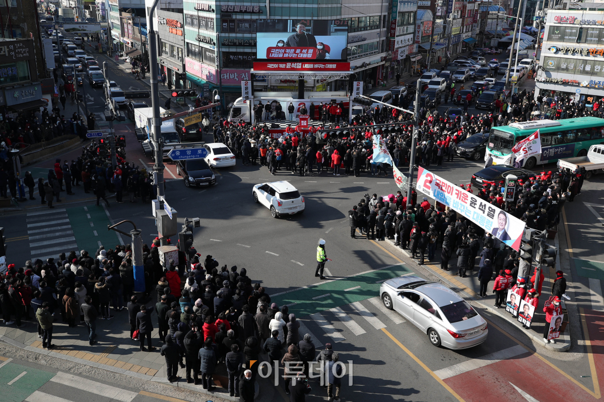 윤석열 국민의힘 대선 후보가 17일 오전 경기도 안성시 서인사거리에서 열린 '윤석열이 대한민국에 안성맞춤!' 안성 유세에서 지지를 호소하고 있다. 국회사진취재단