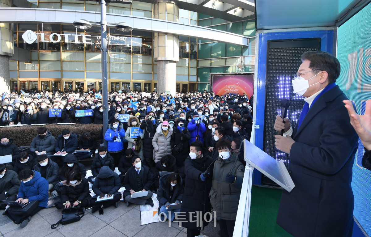 이재명 더불어민주당 대선후보가 17일 오전 서울 노원구 상계동 롯데백화점 노원점 앞에서 유세를 펼치고 있다. 국회사진취재단