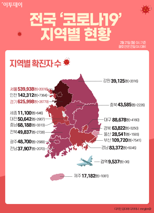신규 확진자 9만5362명 중 2만18명은 서울에서 발생했으며, 부산 7541명, 대구 4160명, 인천 7364명, 광주 2589명, 대전 2907명, 울산 1593명, 세종 646명, 경기 2만6779명, 강원 2016명, 충북 2226명, 충남 3313명, 전북 2728명, 전남 2070명, 경북 3250명, 경남 5045명, 제주에서 1081명이 각각 확진됐다. 확진자 9만5362명 중 지역발생 확진자는 9만5218명으로 집계됐다. 검역소 확진자도 36명이 추가됐다.