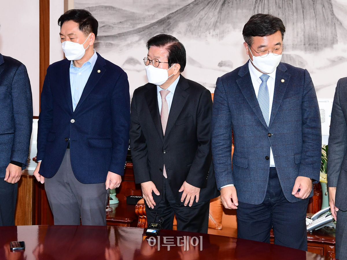 21일 서울 여의도 국회에서 추경안 처리 논의를 위해 열린 박병석 국회의장 주재 여야 원내대표 회동에서 김기현(왼쪽부터) 국민의힘 원내대표, 박 의장, 윤호중 더불어민주당 원내대표가 기념촬영 후 자리로 향하고 있다.