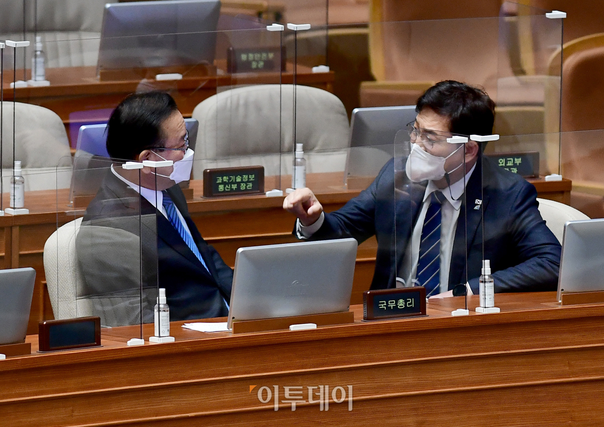 21일 서울 여의도 국회에서 열린 본회의에서 송영길(오른쪽) 더불어민주당 대표와 김부겸 국무총리가 대화하고 있다.