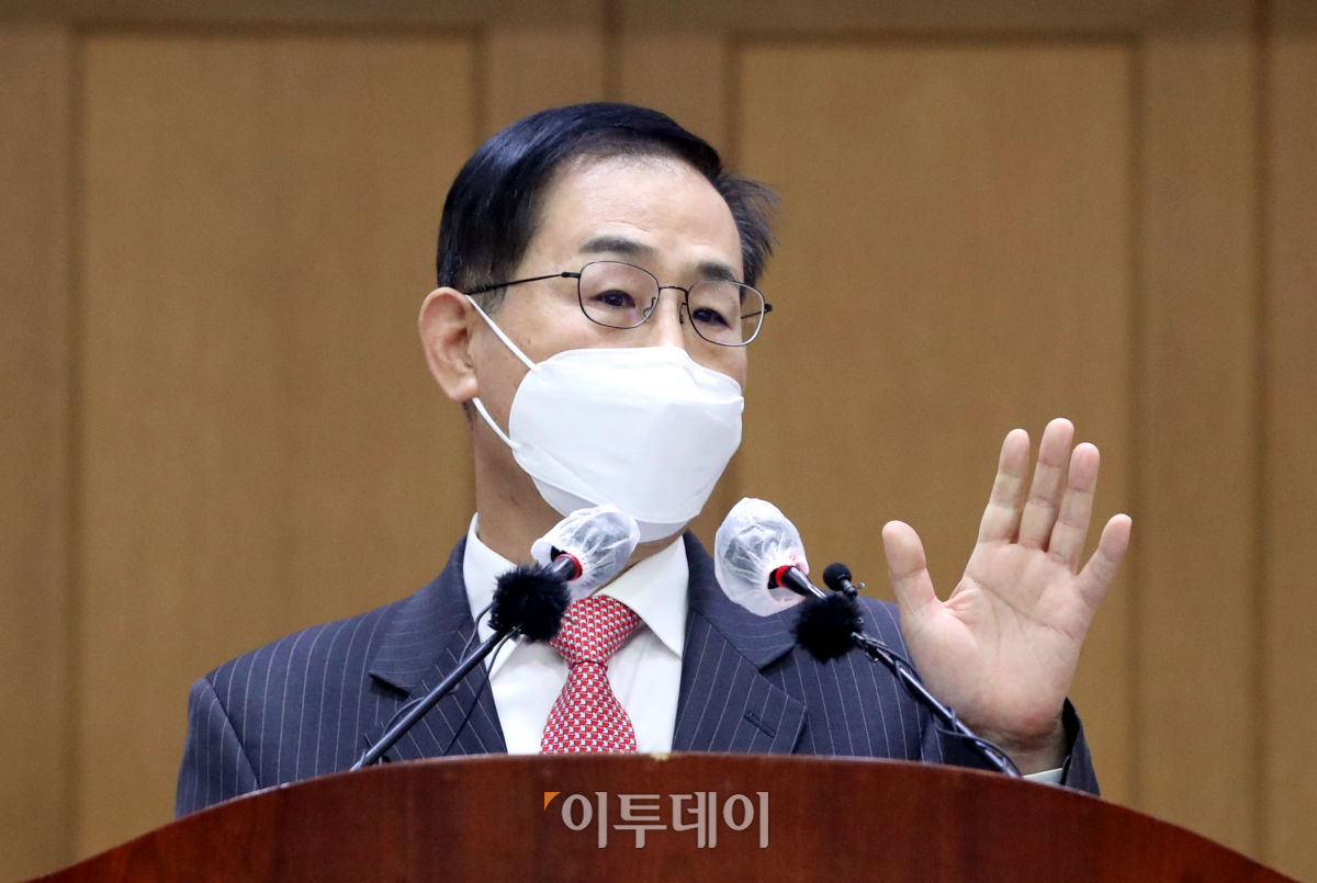 대장동 개발 특혜·로비 관련 녹취록 속에 등장하는 '그분'으로 지목된 조재연 대법관이 23일 오후 서울 서초구 대법원에서 열린 기자회견에서 입장 발표를 하고 있다. 이날 조 대법관은 '그분' 관련 의혹을 전면 부인했다.