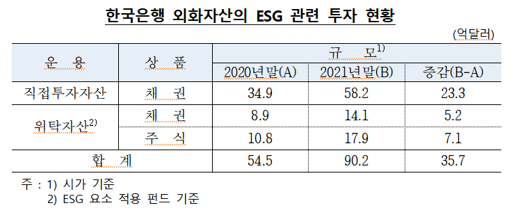 한편, 2021년말 기준 한국은행의 ESG 관련 자산규모는 총 90억2000만 달러 수준이다. 직접투자자산 중 그린본드 등 ESG 관련 채권은 58억2000만 달러, 위탁자산 중 ESG 요소를 적용한 주식·채권 펀드 규모는 32억 달러다.
