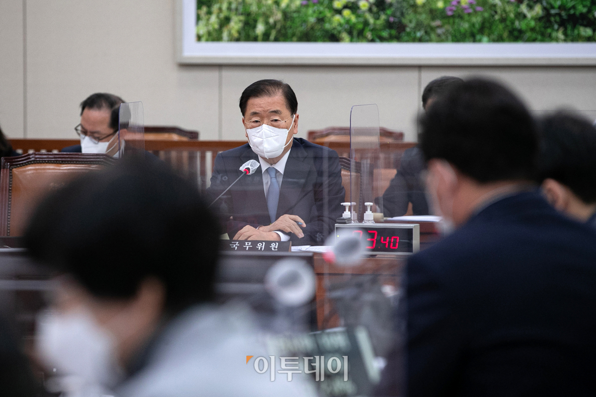 정의용 외교부 장관이 25일 오후 서울 여의도 국회에서 열린 러시아-우크라이나 사태 관련 국회 외교통일위원회 전체회의에서 현안 질의답변을 하고 있다.