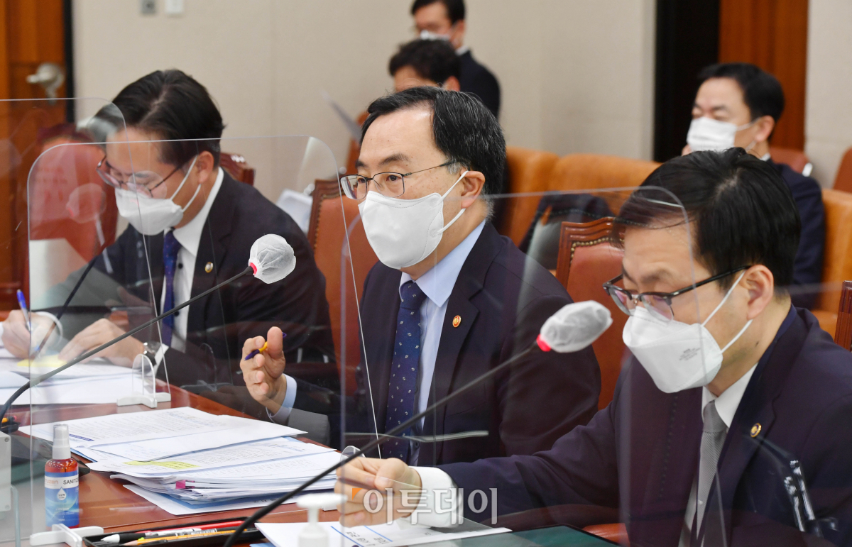 국회 산자중기위는 25일 문승욱 산업통상자원부 장관이 참석한 가운데 전체회의를 열고 우크라이나 사태관련 긴급 현안질의를 가졌다. 문승욱 장관이 의원들의 질의에 답변하고 있다. 1차관, 장관, 통상교섭본부장.