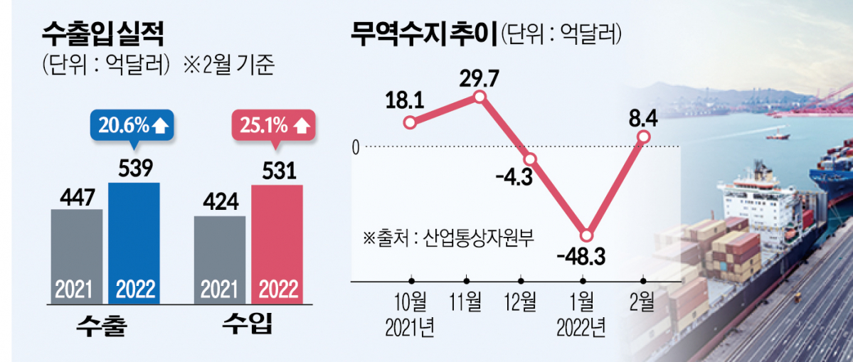 수출과 수입이 모두 늘어난 가운데 무역수지는 8억4000만 달러 흑자로 지난해 1월, 2월에 이어 3개월 만에 흑자로 전환했다. 무역수지가 2개월 연속 적자를 기록한 것은 금융위기 당시인 2008년 이후 14년 만이었다.