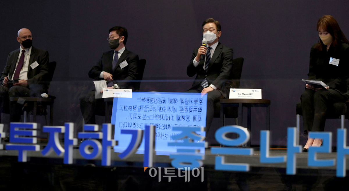 더불어민주당 이재명 대선 후보가 1일 오전 서울 여의도 콘래드호텔에서 주한독일상공회의소와 주한프랑스상공회의소 공동 주최로 열린 외국인 투자기업인들과의 대화 중 참석자들의 질문에 답하고 있다.