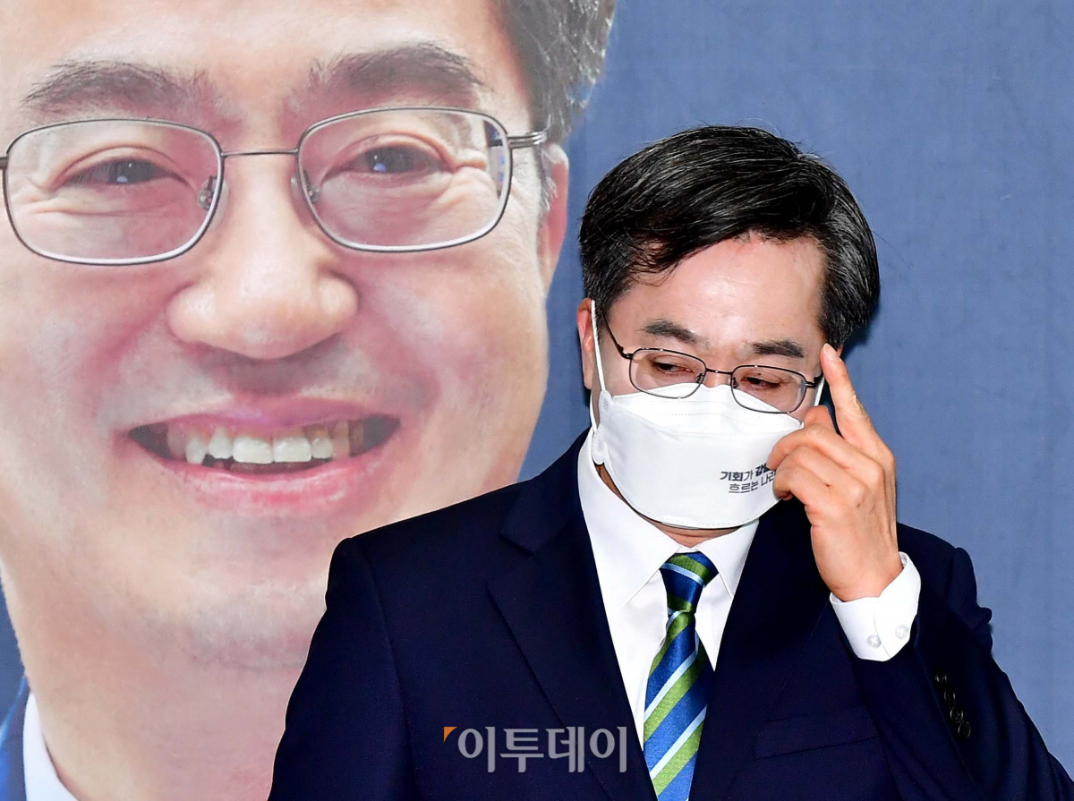 김동연 새로운물결 대선 후보가 2일 서울 영등포구 선거 캠프에서 기자회견을 열고 후보 사퇴 및 이재명 더불어민주당 후보의 지지 의사를 밝히기 앞서 잠시 생각에 잠겨 있다.
