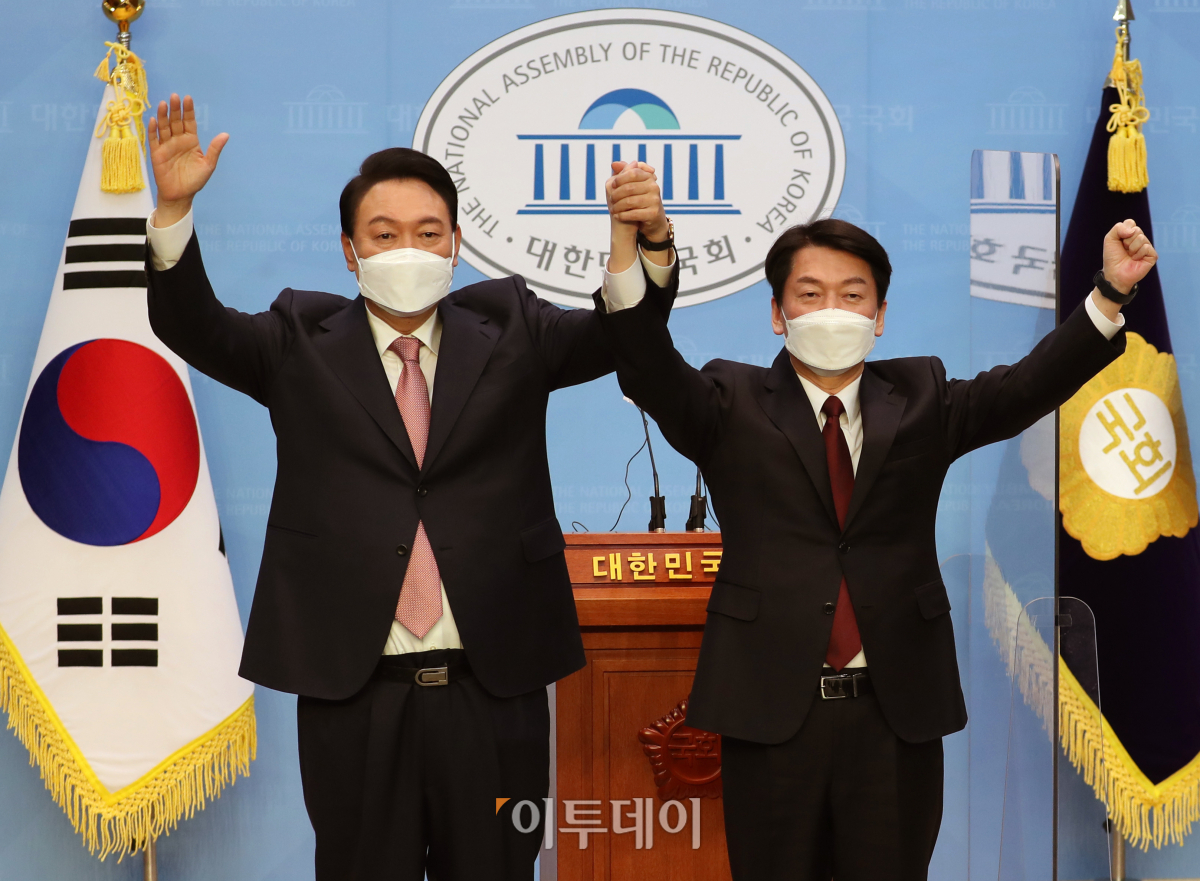 야권 단일화에 전격 합의한 국민의힘 윤석열 대선 후보와 국민의당 안철수 대선 후보가 3일 오전 서울 여의도 국회 소통관에서 공동 기자회견을 마친 뒤 함께 손을 들어 올리고 있다.