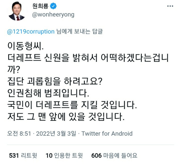 이와 관련해 원희룡 국민의힘 선대본부 정책본부는 “더레프트 신원을 밝혀서 어떡하겠다는 것이냐”고 반문하며 “그것은 인권침해 범죄”라고 지적했다. 또 “국민이 더레프트를 지킬 것”이라며 “나도 그 앞에 있을 것”이라고 덧붙였다.
