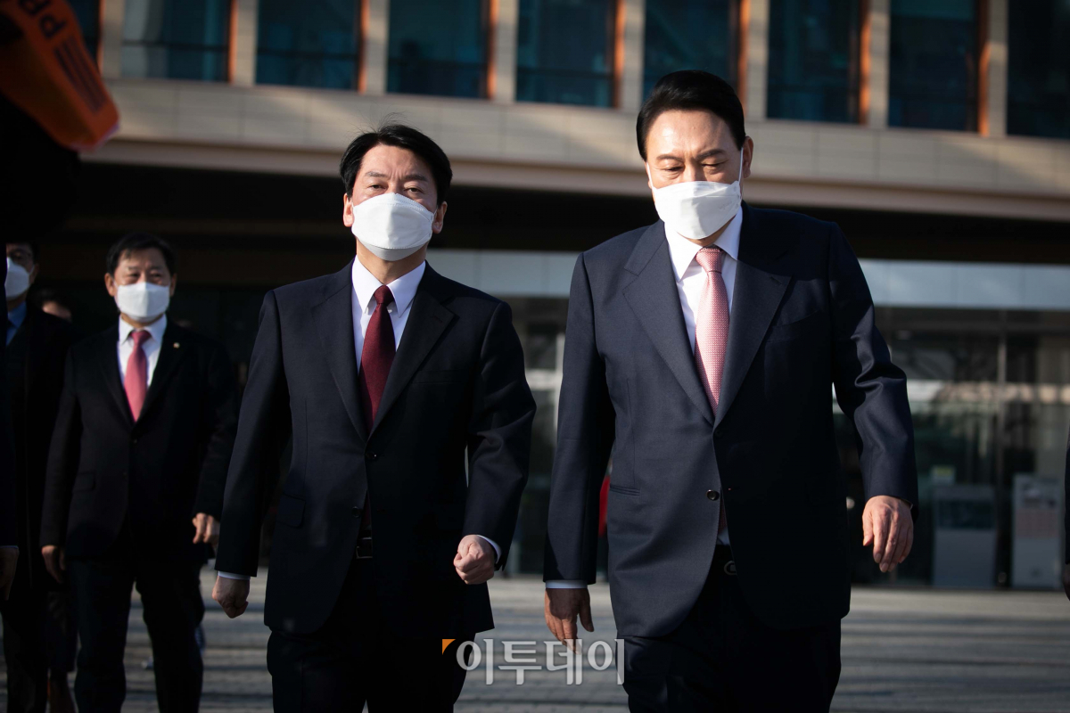 안철수 국민의당 대선후보와 윤석열 국민의힘 대선후보가 3일 새벽 후보 단일화에 극적으로 합의하면서 이날 오전 서울 여의도 소통관에서 공동 기자회견을 마친 후 함께 소통관을 나가고있다.
