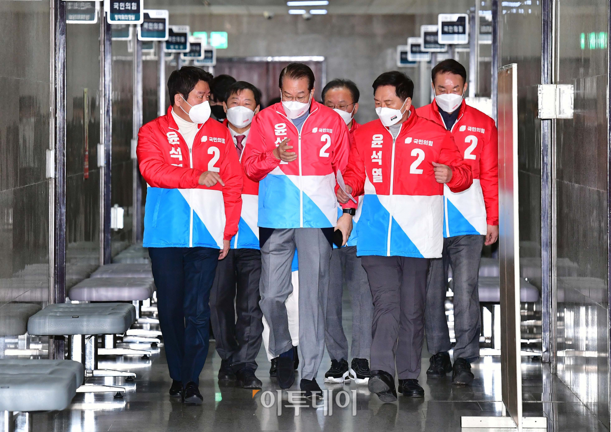 권영세(가운데) 국민의힘 총괄선대본부장, 김기현(오른쪽) 원내대표, 유의동 정책위의장이 3일 서울 여의도 국회에서 열린 국민의힘 확대선거대책본부 회의에 참석하고 있다.