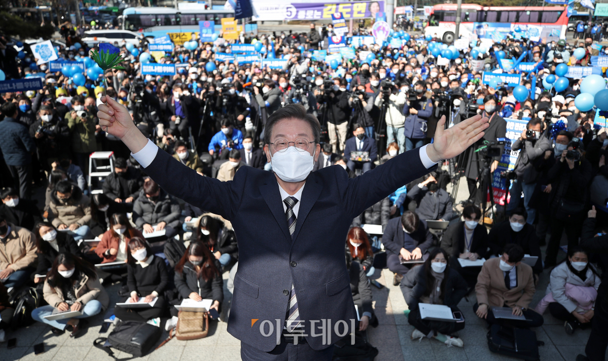 이재명 더불어민주당 대선 후보가 3일 오후 서울 종로구 보신각 앞에서 열린 '우리 모두를 위해, 성평등 사회로' 여성 유세에서 '기적'이라는 꽃말을 가진 파란 장미를 들고 시민과 지지자들에게 인사하고 있다. 국회사진취재단
