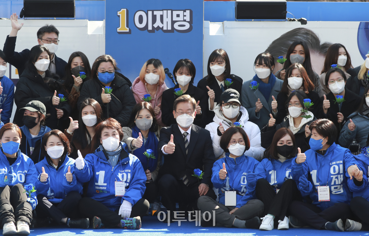 이재명 더불어민주당 대선후보가 3일 오후 서울 종로 보신각터에서 열린 ‘우리 모두를 위해, 성평등 사회로’ 유세에서 여성 유권자들과 기념촬영을 하고 있다.