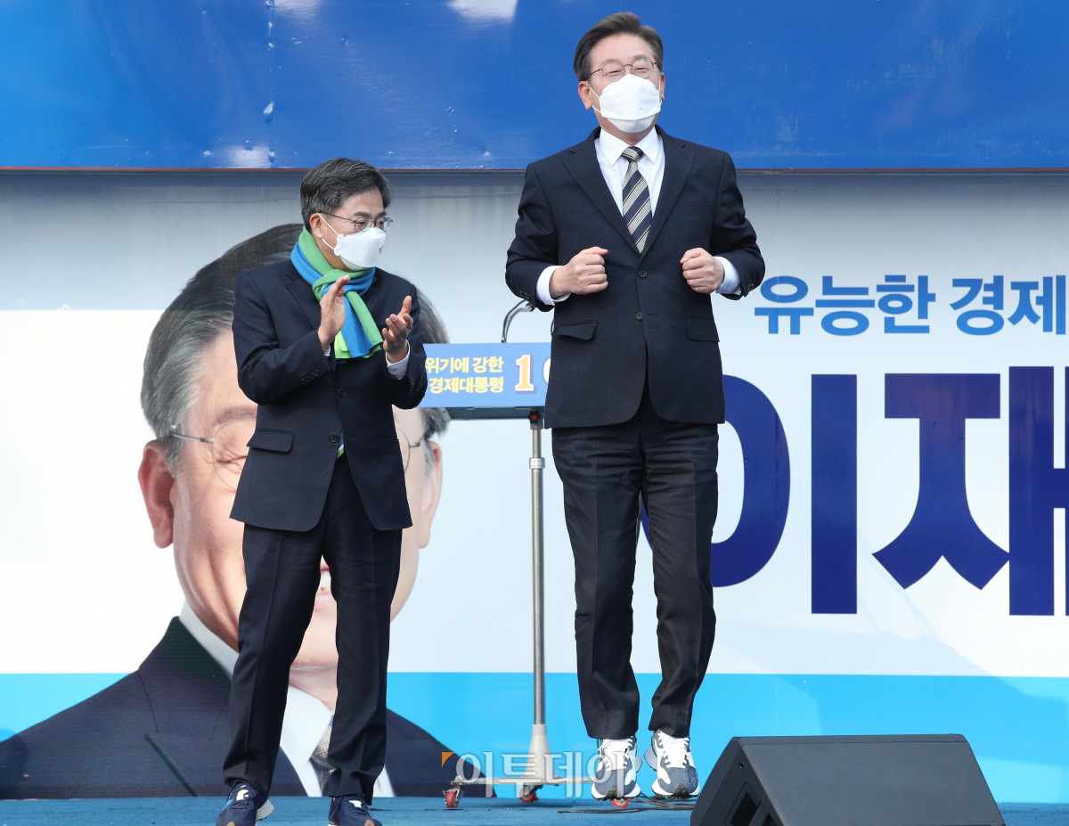 이재명 더불어민주당 후보(왼쪽)가 3일 오후 서울 영등포구 타임스퀘어 광장에서 열린 유세에서 함께 입장한 김동연 새로운물결 당 대표가 선물한 운동화를 신고서 제자리에서 뛰어보고 있다. 국회사진취재단