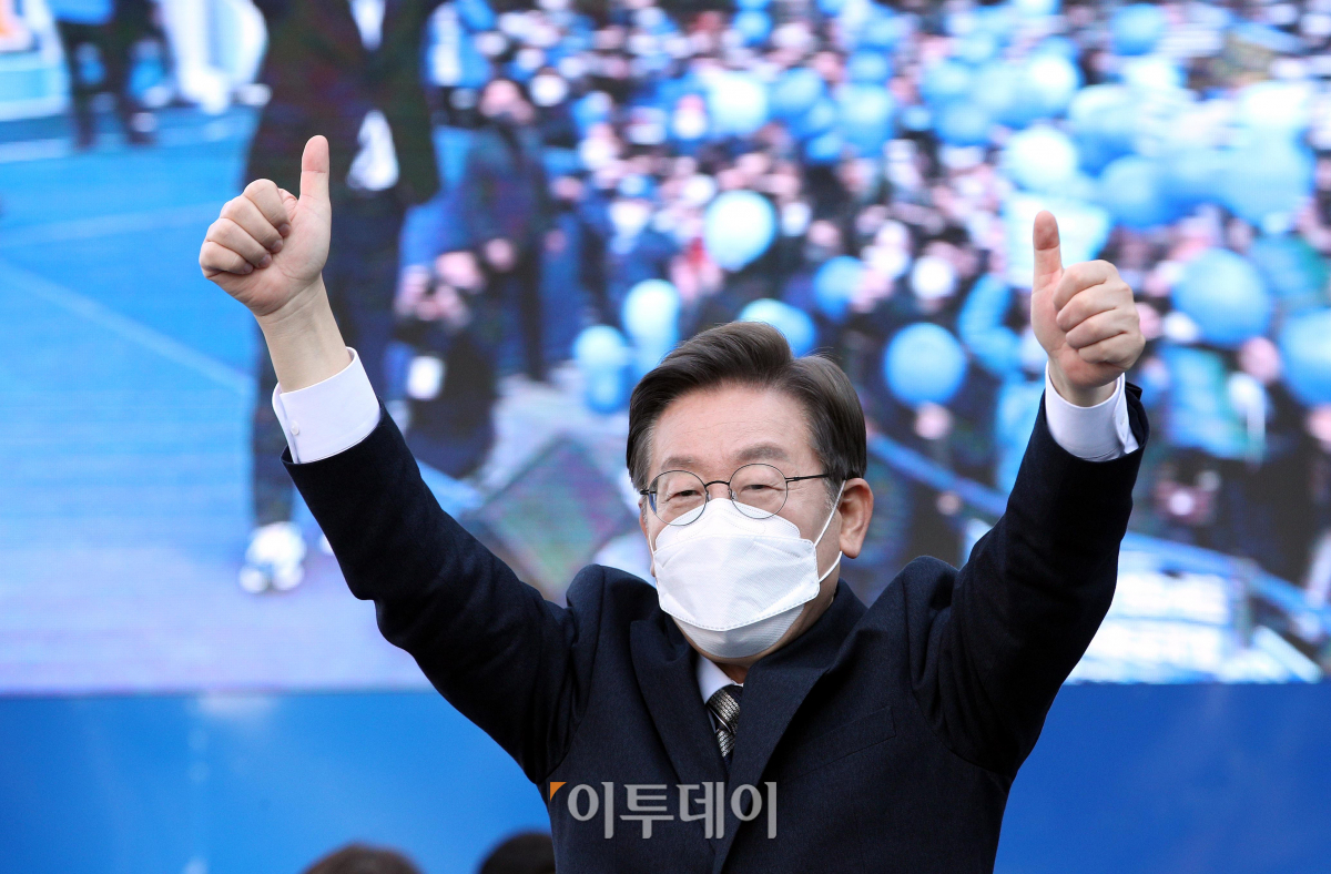 이재명 더불어민주당 후보가 3일 오후 서울 영등포구 타임스퀘어 광장에서 열린 유세에서 지지를 호소하고 있다. 국회사진취재단