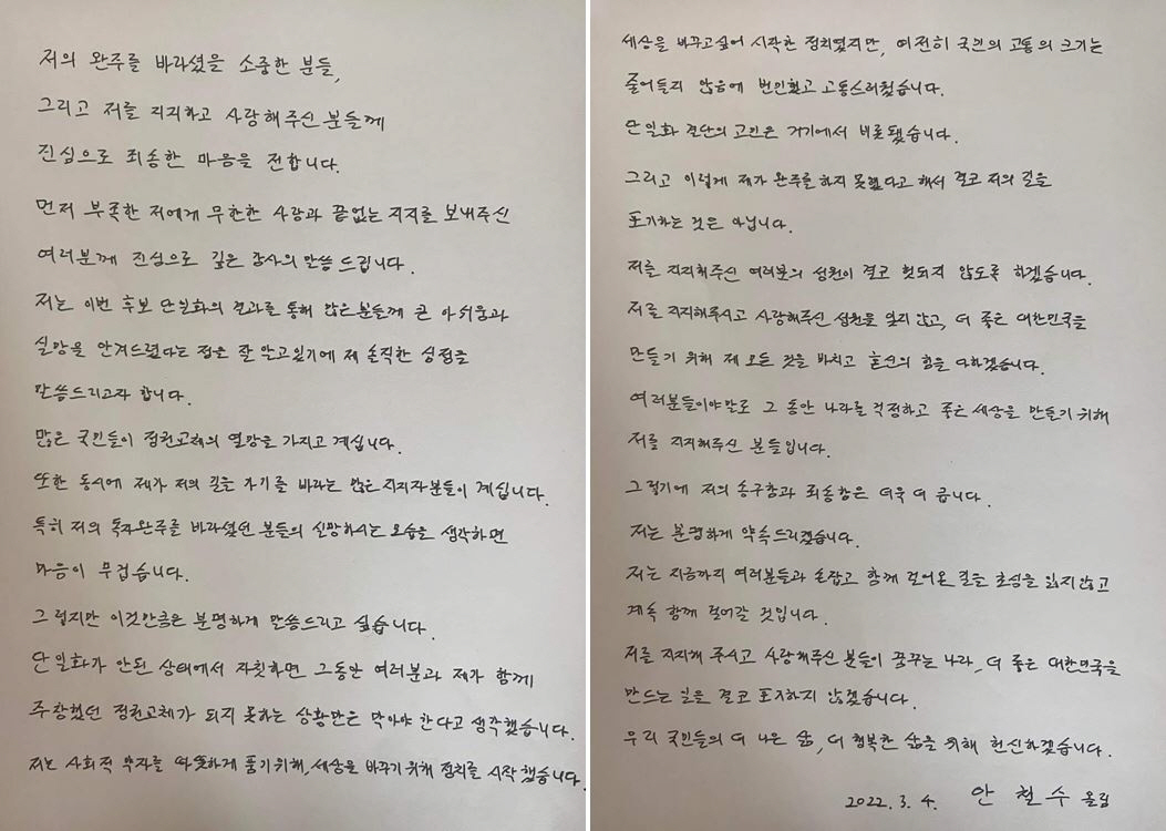 대통령선거 사전투표일을 하루 앞두고 윤석열 국민의힘 대선 후보와 전격 단일화를 선언하고 후보에서 물러난 안철수 국민의당 대표가 지지자들에게 손편지를 올렸다.