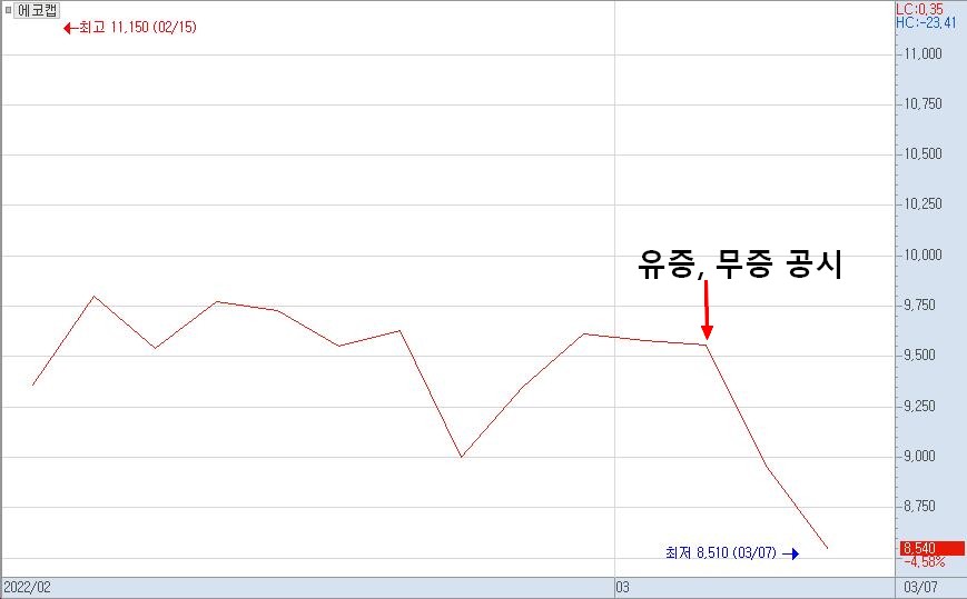 에코캡은 유증과 더불어 1주당 0.3주의 신주를 배정하는 무상증자도 병행한다. 신주 배정 기준일은 6월 14일이며 587만4630주의 신주가 발행된다. 주식 수량이 늘어나는 반면 시가총액은 그대로인 탓에 주가를 낮추는 ‘권리락’으로 주가가 내려간다.