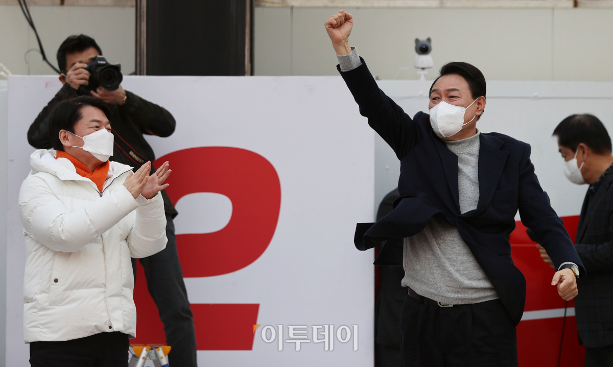 윤석열 국민의힘 대선 후보와 안철수 국민의당 대표가 7일 오후 경기 화성시 동탄센트럴파크에서 열린 유세에서 시민들에게 지지를 호소하고 있다.