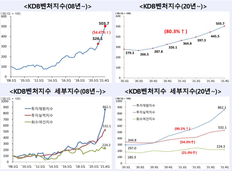 특히 KDB벤처지수는 지난 2년간의 성장세가 가파르다. 2020년 1분기(279.3) 대비 약 80% 상승했다.