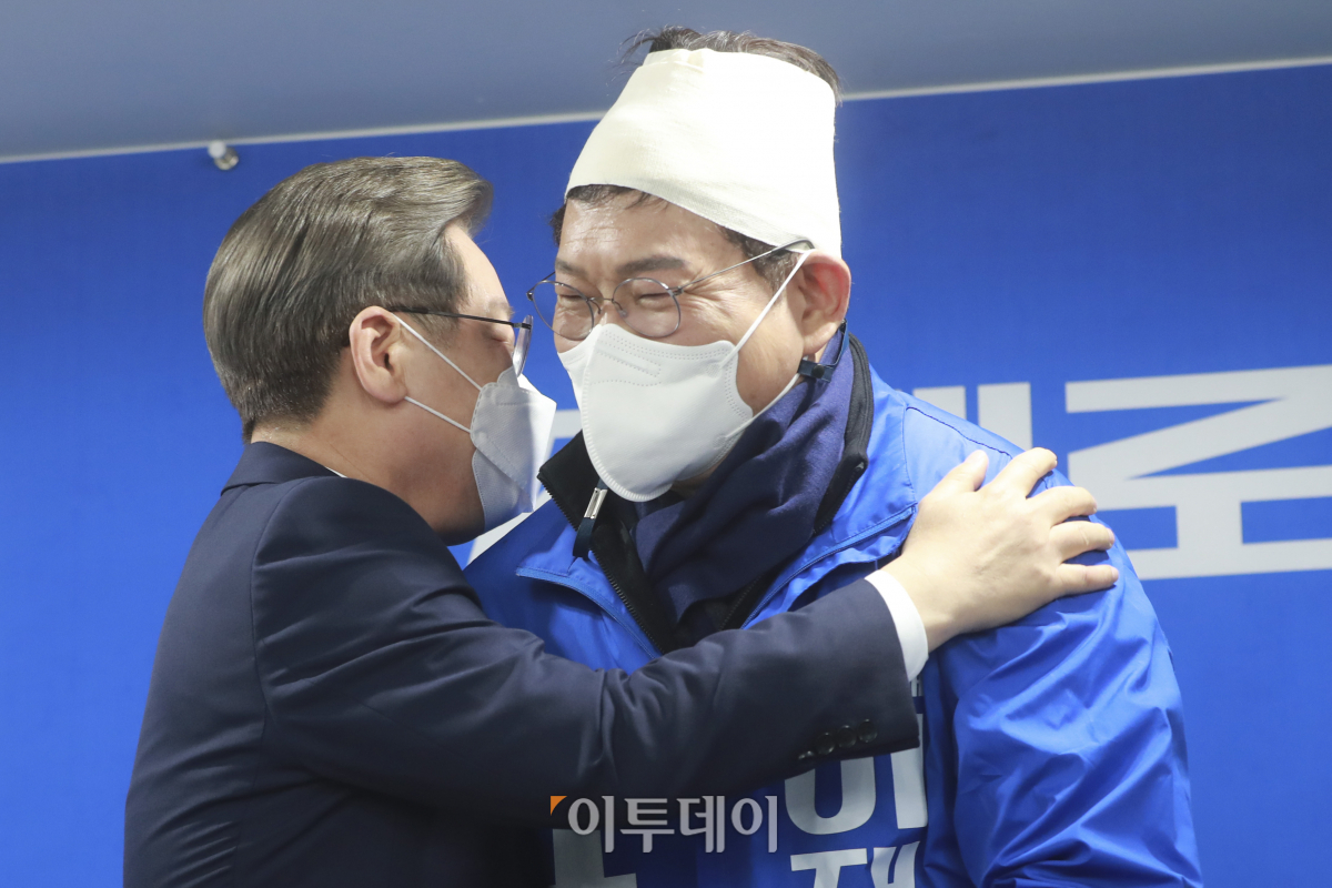 이재명 더불어민주당 대선후보가 8일 오전 서울 여의도 당사에서 '위기극복, 국민통합 특별 기자회견'에서 전일 선거운동 중 괴한에게 둔기 피습을 당한 송영길 대표를 안고 있다.