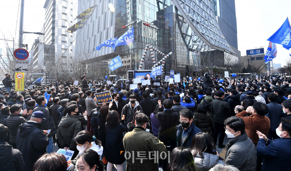 이재명 더불어민주당 대선 후보가 8일 서울 여의도우체국 앞 유세현장에서 시민들에게 지지를 호소하고 있다.