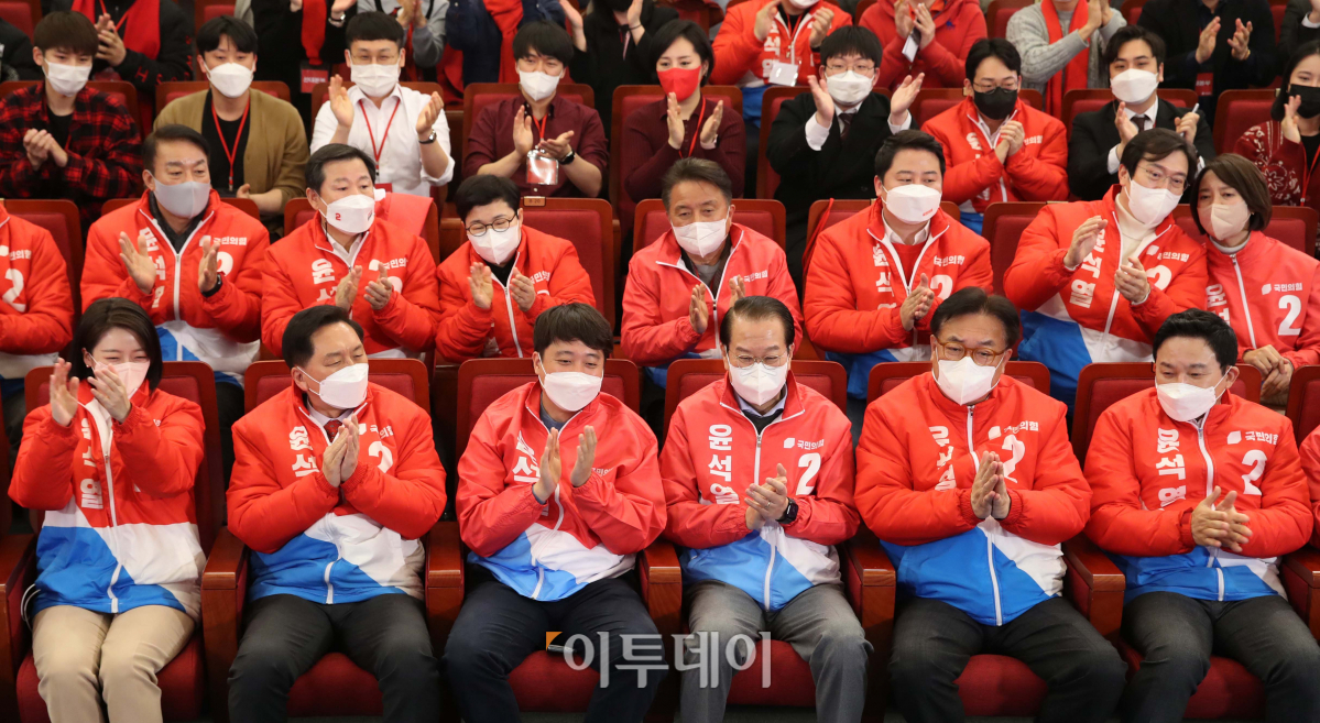 이준석 국민의힘 대표, 권영세 선대본부장 등이 9일 서울 여의도 국회 도서관에 마련된 제20대 대선 개표상황실에서 출구조사 결과가 발표되자 박수치고 있다.