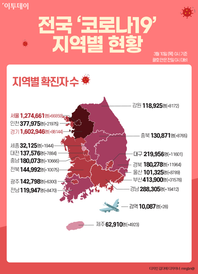 질병관리청 중앙방역대책본부에 따르면 10일 0시 기준 코로나19 확진자는 전날 0시 발표 때보다 32만7549명 늘었다.