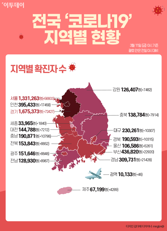 신규 확진자 28만2987명 중 5만6603명은 서울에서 발생했으며, 부산 2만2920명, 대구 1만307명, 인천 1만7458명, 광주 8848명, 대전 7212명, 울산 5261명, 세종 1840명, 경기 7만2427명, 강원 7482명, 충북 7914명, 충남 1만798명, 전북 8852명, 전남 8987명, 경북 1만315명, 경남 2만1428명, 제주에서 4289명이 각각 확진됐다. 확진자 28만2987명 중 지역발생 확진자는 28만2880명으로 집계됐다. 검역소 확진자도 46명이 추가됐다.
