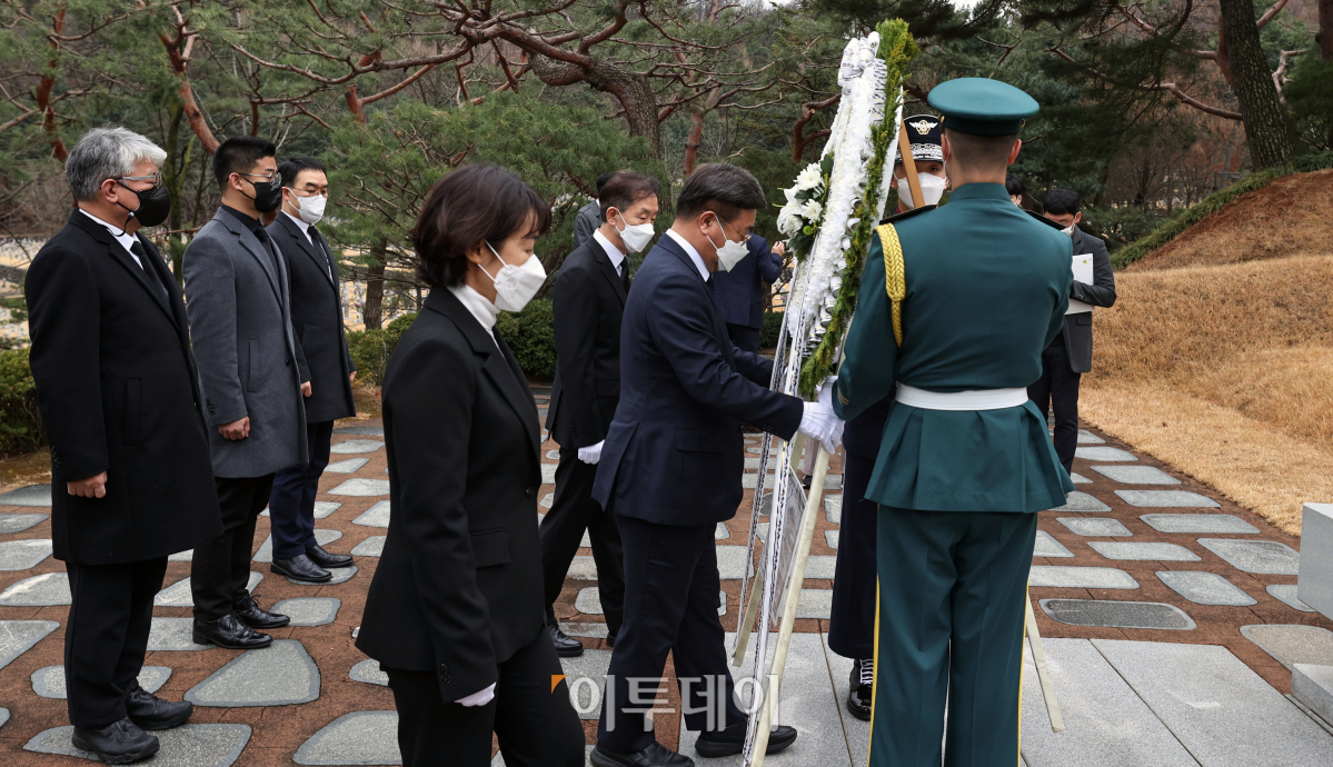 윤호중 더불어민주당 비상대책위원장이 14일 서울 동작구 국립서울현충원 김대중대통령묘소를 찾아 화환을 헌화하고 있다. 국회사진취재단