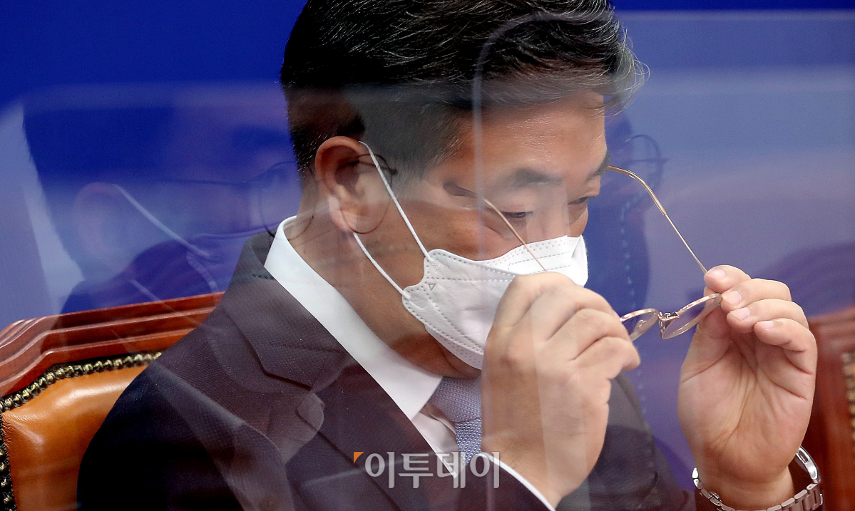 윤호중 더불어민주당 비상대책위원장 겸 원내대표가 14일 오전 서울 여의도 국회에서 열린 비상대책위원회의에서 안경을 고쳐쓰고 있다.
