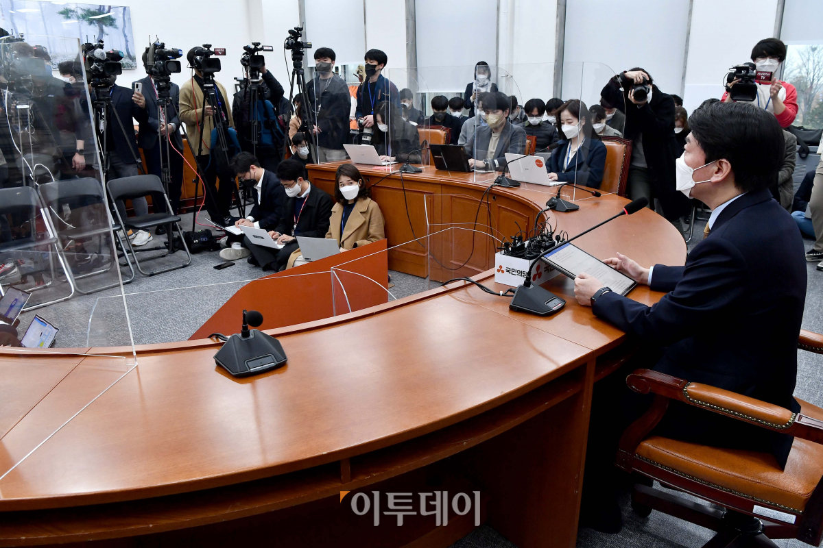 안철수 대통령직인수위원회 위원장이 14일 서울 여의도 국회에서 기자간담회를 갖고 있다.