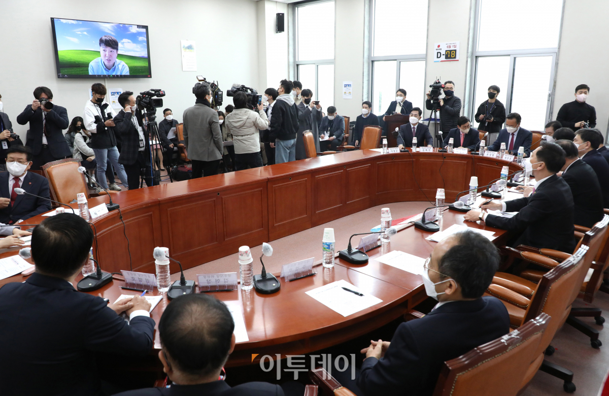국민의힘 이준석 대표가 15일 서울 여의도 국회에서 열린 시도당위원장 회의에서 화상으로 참석해 발언하고 있다.