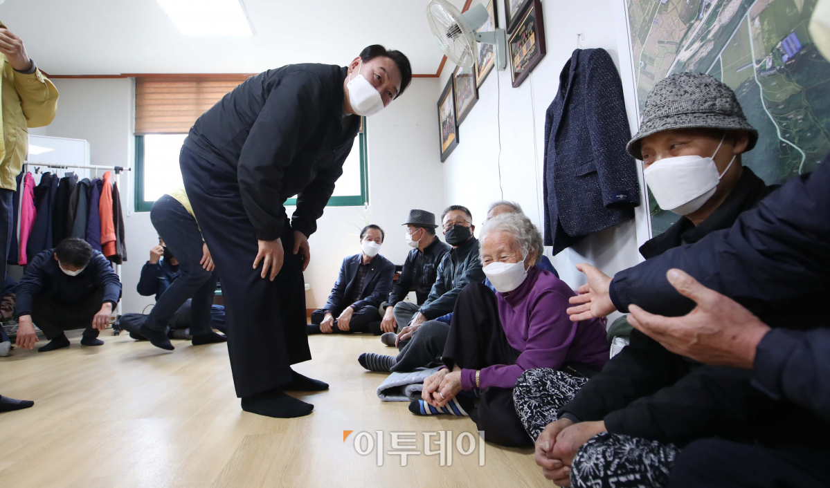 윤석열 대통령 당선인이 15일 경북 울진군 북면 부구3리마을회관에서 산불 피해 이재민들과 간담회 마친 후 인사하고 있다. 국회사진취재단