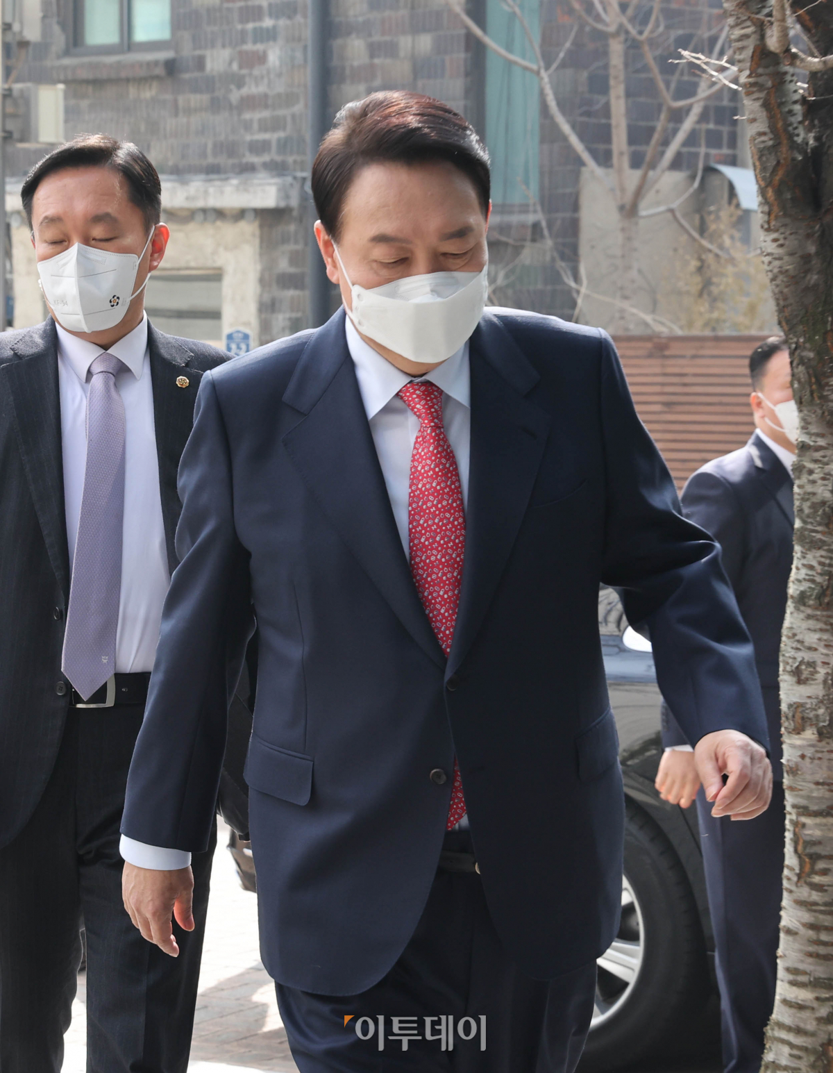 문재인 대통령과 윤석열 당선인이 청와대에서 하기로 했던 오찬 회동이 무산된 16일 윤 당선인이 서울 종로구 통의동 금융감독원 연수원에 마련된 당선인 집무실로 출근하고 있다. 국회사진취재단