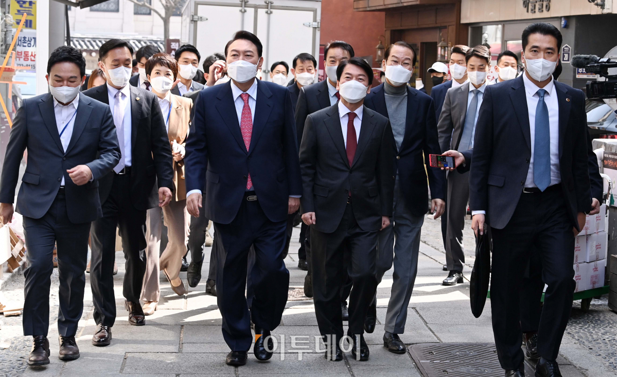 윤석열 대통령 당선인이 16일 오후 서울 종로구 통의동 집무실에서 점심 식사를 위해 안철수 인수위원장, 권영세 인수위 부위원장, 원희룡 기획위원장 등과 함께 식당으로 이동하고 있다. 국회사진취재단