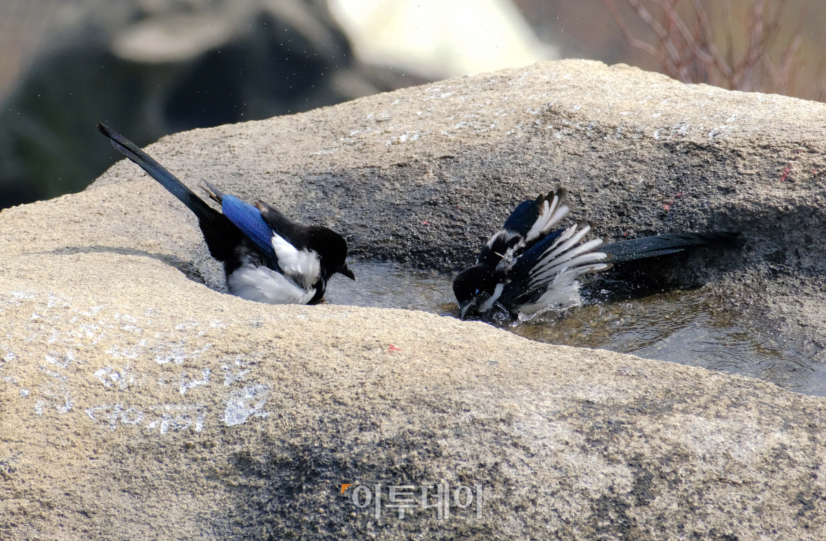 [포토] '미세먼지 싫어요' 봄맞이 목욕하는 까치