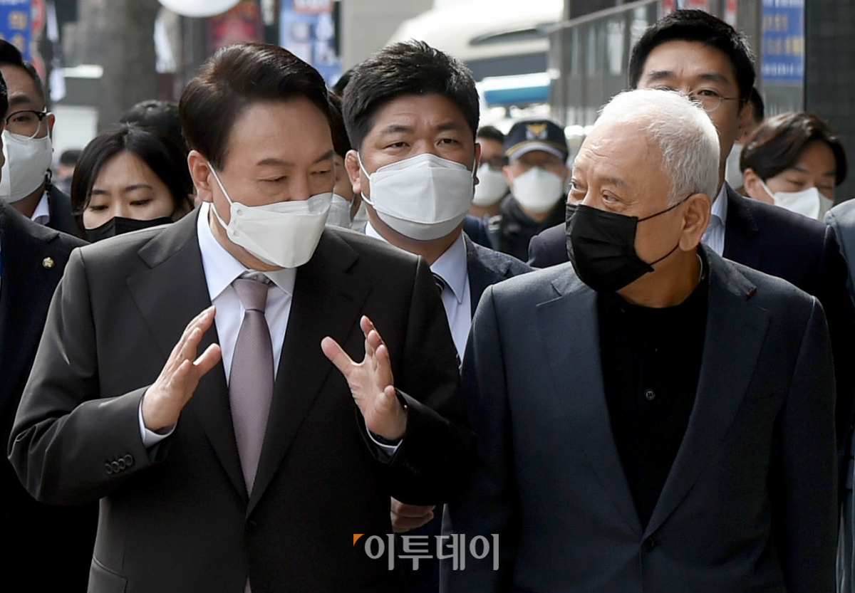 윤석열 대통령 당선인이 17일 점심식사를 위해 김한길 국민통합위원회 위원장과 함께 서울 종로구 통의동 당선인 집무실에서 인근 식당으로 향하며 대화를 나누고 있다.