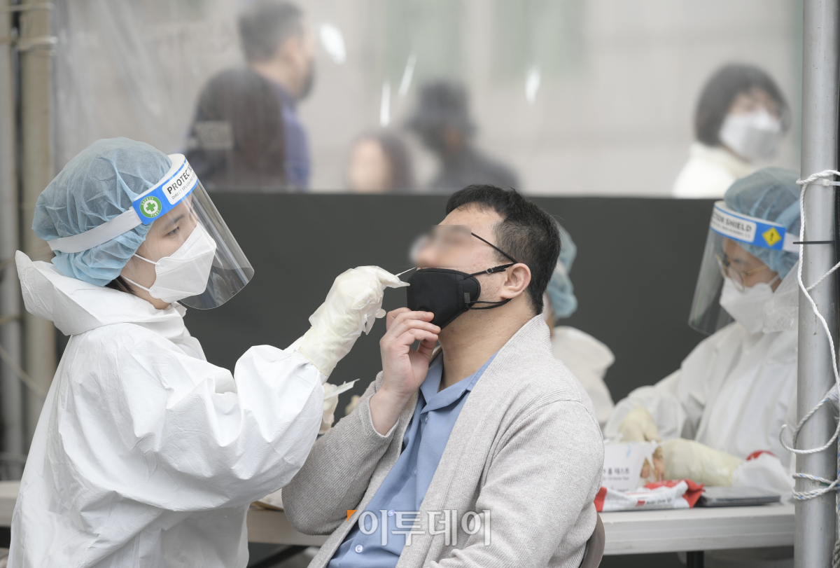 코로나19 신규 확진자 수가 60만명대를 기록하며 폭증한 17일 서울 중구 서울역 임시선변진료소에서 한 시민이 신속항원검사를 받고 있다. 중앙방역대책본부에 따르면 이날 0시 기준 국내 발생 신규 확진수가 62만1328명, 코로나19로 숨진 사망자는 429명으로 집계 됐다고 밝혔다.