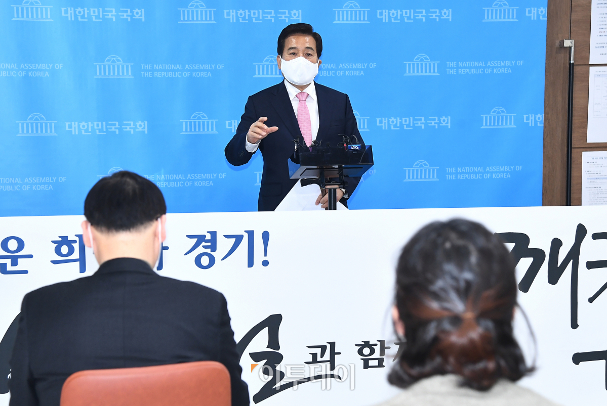 심재철 전 국회부의장이 17일 서울 여의도 국회에서 6·1 전국동시지방선거 국민의힘 경기도지사 출마 기자회견을 한 뒤 기자들의 질의에 답변하고 있다.