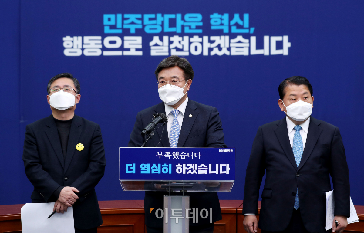 윤호중 더불어민주당 공동비상대책위원장이 20일 오후 서울 여의도 국회에서 기자간담회를 가진 뒤 취재진 질문에 답하고 있다. (왼쪽부터)김성환 의원, 윤 비대위원장, 김병주 의원.