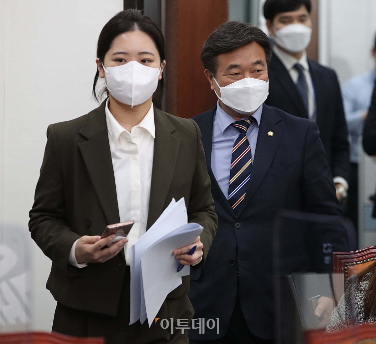 윤호중 더불어민주당 비상대책위원장(오른쪽)과 박지현 공동비상대책위원장(왼쪽)이 21일 서울 여의도 국회에서 열린 비상대책회의에 입장하고 있다.