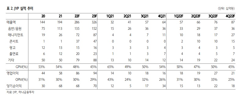 이 연구원은 “트와이스, 스트레이키즈 등의 컴백과 일본 내 오프라인 활동 재개에 따른 니쥬의 가파른 매출 기여, 분기 기준 최대인 유튜브 매출(57억 원) 및 리퍼블릭레코즈향 정산(40억 원) 등이 기여했다”며 “영업 외적으로는 디어유 지분법 손익 및 제페토 공정가치평가 이익도 각각 158억 원, 146억 원 반영됐다”고 설명했다.