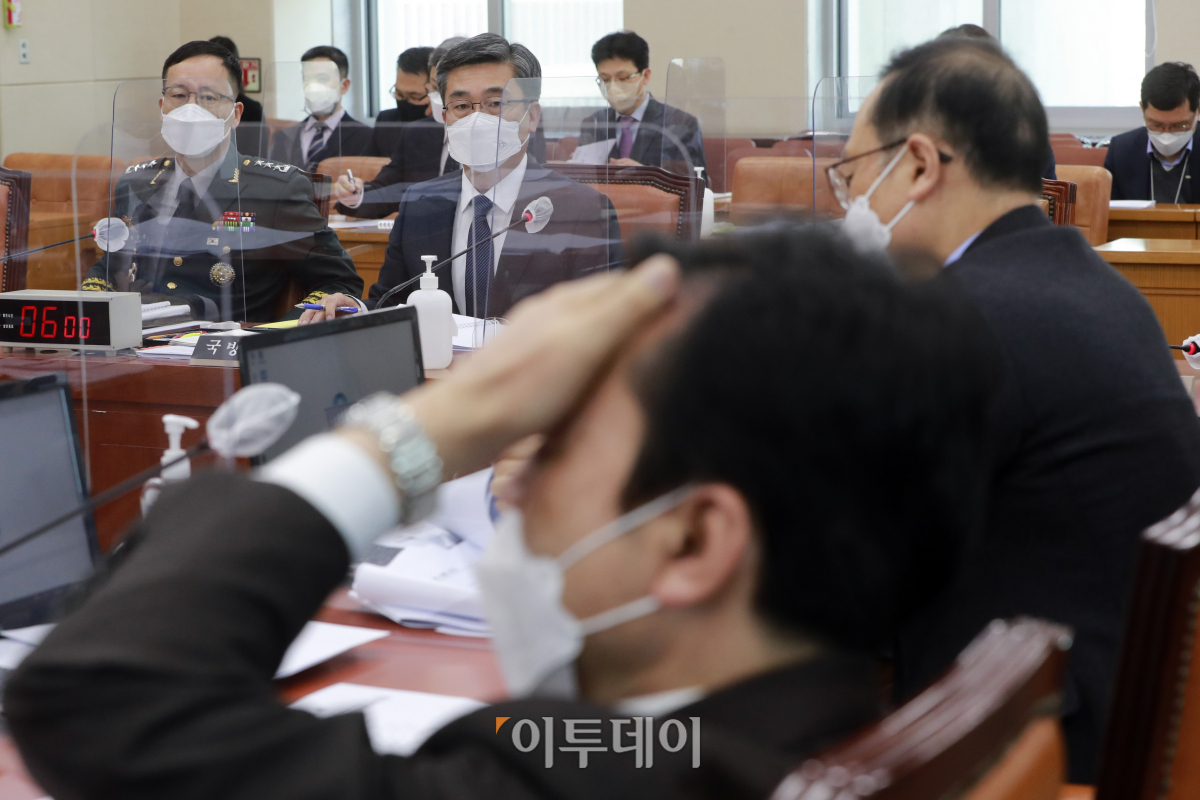 서욱 국방부 장관이 22일 오전 서울 여의도 국회에서 열린 국방위원회 전체회의에 자리한 가운데 안규백 더불어민주당 의원이 이마에 손을 올리고 있다.