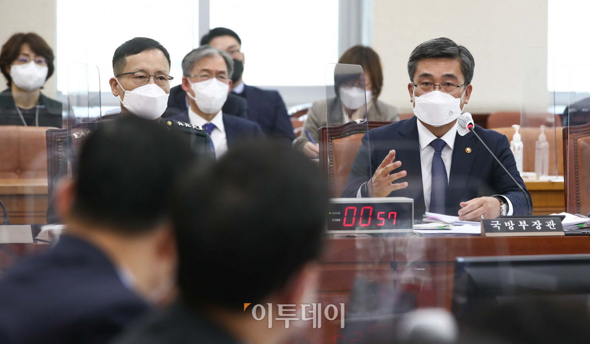 서욱 국방부 장관이 22일 국회에서 열린 국방위원회 전체회의에서 의원들의 질문에 답변하고 있다.