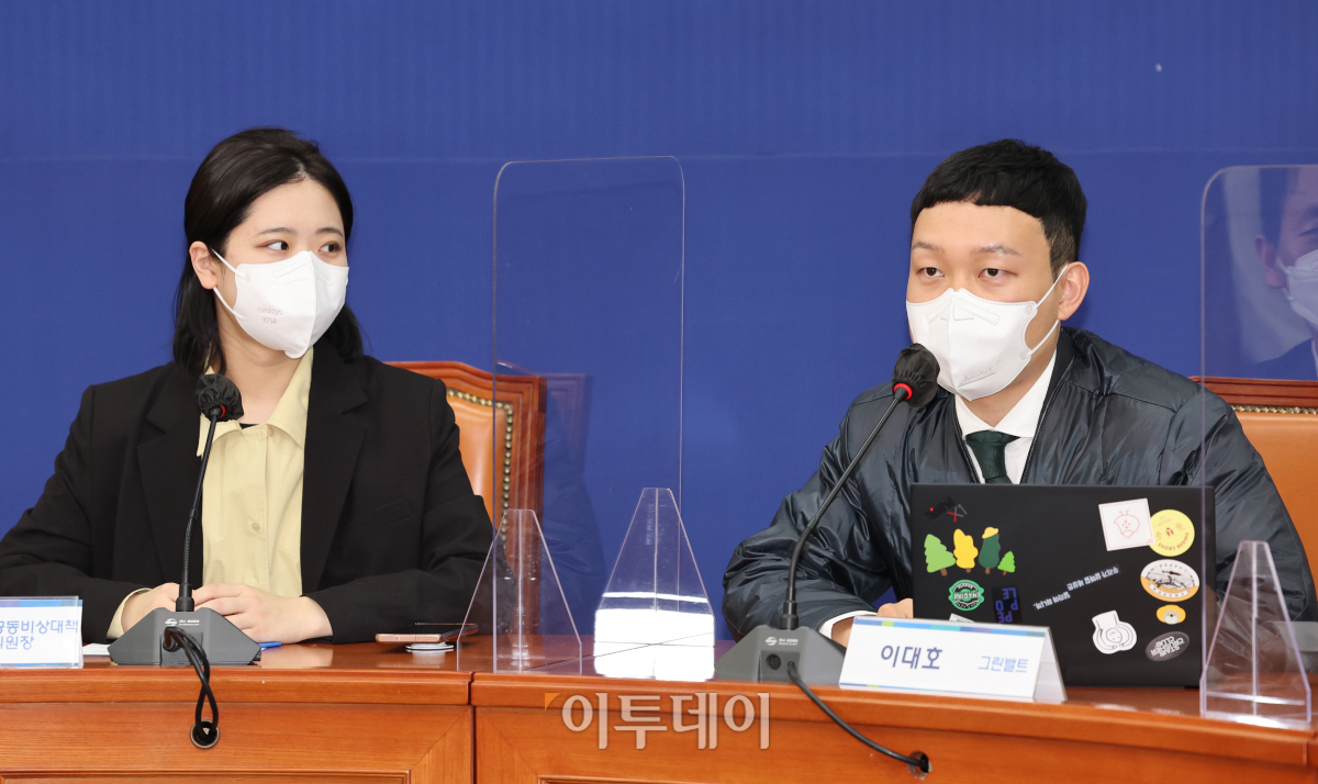 2045 더불어민주당 정치인 연대 '그린벨트'의 이대호 공동위원장(오른쪽)이 22일 오후 서울 여의도 국회에서 열린 '그린벨트'와 민주당 비대위와의 간담회에서 발언하고 있다. 왼쪽은 더불어민주당 박지현 공동비상대책위원장.